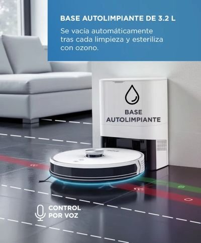 Cuando vuelve a la base con el depósito lleno, se vacía automáticamente en la estación. También tiene recarga y reanuda: si se queda sin batería, vuelve a la base para cargarse y luego retoma la limpieza donde la dejó. Además, con la app podés elegir distintos modos y usar funciones como la limpieza programada (por ejemplo, “No molestar”, batería mínima, etc.).
