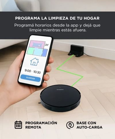Lo bueno es que tiene una app llamada Tuya, desde la que podés controlar el robot y programar limpiezas. Además, cuenta con auto-recarga, que le permite volver a la base cuando se queda sin batería. Lo malo es que no mapea, y a veces la vuelta a la base no es perfecta: si la base está lejos o en otra habitación, puede que no la encuentre. Tampoco tiene base multiuso, así que no se autovacía.